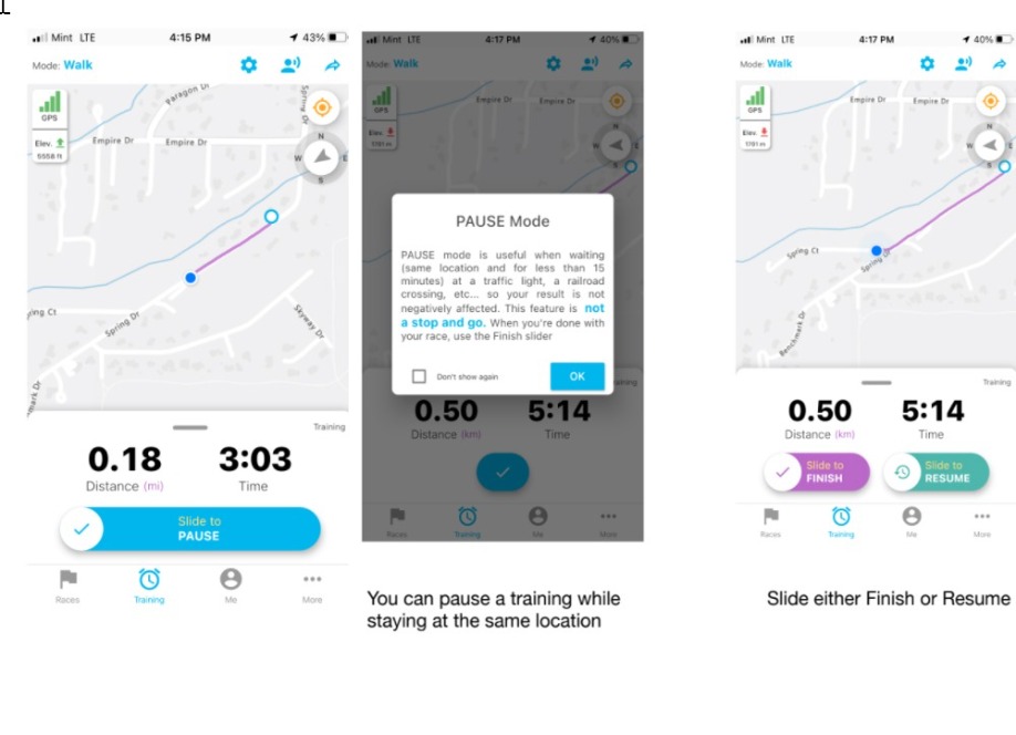 • At any time during your training your can slide the PAUSE bar to pause your session. Keep in mind this is to be used for a pause of 15 minutes or less.